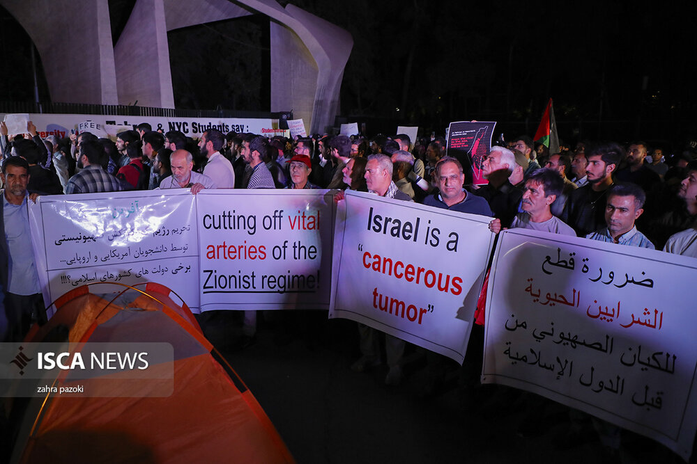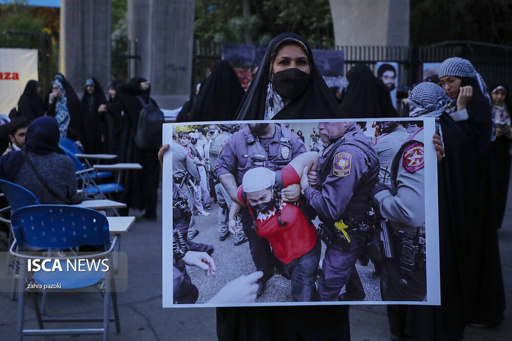 دانشگاهیان دانشگاه تهران مقابل سردر این دانشگاه تجمع کردند و حمایت خودشان را از دانشجویان آمریکایی و اروپایی اعلام کردند.
