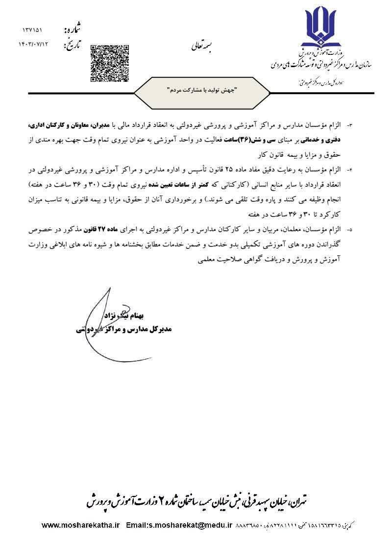 معلم دیگری از رشت نوشته: حقوق و بیمه من در سامانه مشارکتها قانونی ثبت شده است اما واریزی من سه میلیون تومان است و تنها ۱۰ روز بیمه پرداخت میشود. موسس زنگهای هنر، ورزش و تفریح را از ساعت کار من کم میکند. من از هشت صبح تا یک و نیم ظهر کار میکنم و هفت میلیون با ۱۵ روز بیمه دریافتی دارم.
