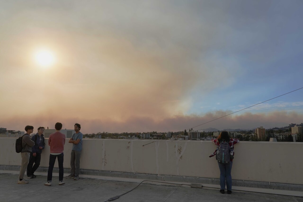 دانشجوها درحال تماشای دود ناشی از آتش سوزی Palisades در سکوی پارکینگ دانشگاه