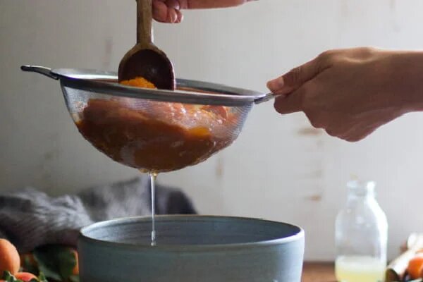 حالا و در دومین مرحله از طرز تهیه شربت زردآلو نوبت تهیه آب زردآلو است. برای تهیه آب زردآلو باید پورده زردآلو را از صافی رد کنید و خوب فشار دهید تا آب زردآلو خارج شود. بعد آب حاصل را در قابلمه بریزید و بگذارید روی گاز و شکر را اضافه کنید و خوب هم بزنید و بگذارید خوب مواد بپزد و قل بزند و کف کند. کف حاصل را از روی قابلمه بردارید و دور بریزید.