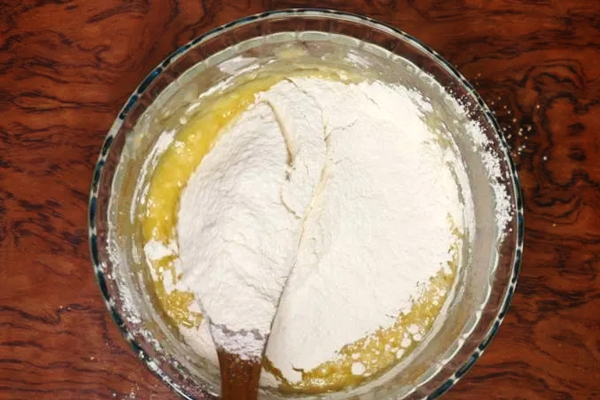 پس از آن، مواد خشک را به تدریج به مواد مرطوب اضافه کنید. با کاردک یا همزن دستی مواد را به آرامی هم بزنید. همه مواد باید به خوبی ترکیب شوند. مراقب باشید زیاد هم نزنید تا کیکتان خشک نشود.
