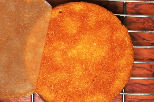 پس از پایان پخت، روی کیک نسبتا خشک خواهد بود. در صورتی که هنوز مرطوب احساس شد، چند دقیقه دیگر اجازه دهید بپزد. در نهایت قالب کیک را برای ۱۰ تا ۱۵ دقیقه روی توری فلزی قرار دهید تا کف کیک رطوبت اضافی نگیرد. کیک را روی توری فلزی برگردانید و کامل خنک کنید.