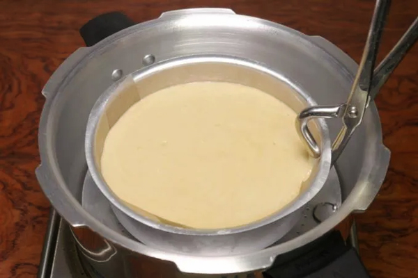 قالب کیک را با دقت با انبر بردارید و داخل قابلمه روی سه پایه یا پایه فاصلهگذار قرار دهید. در این مرحله، از داغ بودن قابلمه کامل اطمینان حاصل کنید تا حرارت به طور یکنواخت به همه قسمتهای کیک برسد.